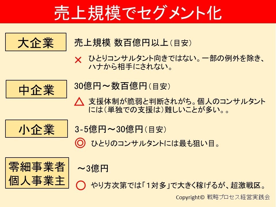 「大企業」というセグメントがありますが、ここは個人の経営コンサルタントが狙うべきではありません。ほとんどの場合、相手にされず、大手コンサルティング会社との競合となるため、勝負にならないからです。