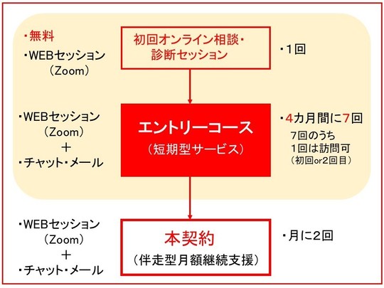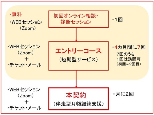 「初回オンライン相談・診断セッション」を受けた後に、継続的な支援を希望される場合は、「エントリーコース」に進んでいただけます。