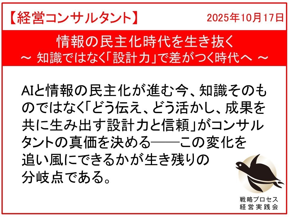 それを明確に言語化できる人こそ、この変化の時代を自分のチャンスに変えられるはずです。「情報の民主化」は脅威ではなく、使い方次第で最強の追い風になるはずです。