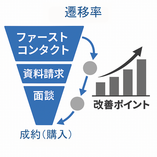 例えば、1)サイト訪問(ファーストコンタクト)から資料請求、2)資料請求から問い合わせ、3)問い合わせから初回購入、4)初回購入から継続利用…このように「ある行動」から「次の行動」への“移行(遷移)率”を数値で把握します。